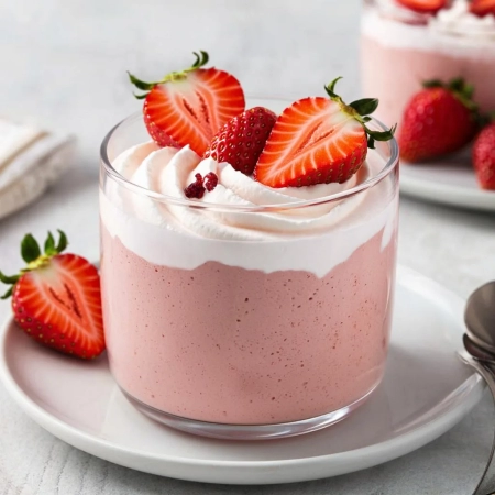 Вот так вот быстро и просто готовится этот восхитительный клубничный мусс! Он отлично подойдёт как самостоятельный десерт или дополнение к блинчикам, панкейкам, тортикам и пирогам. Приятного аппетита! 🌸🥤😉